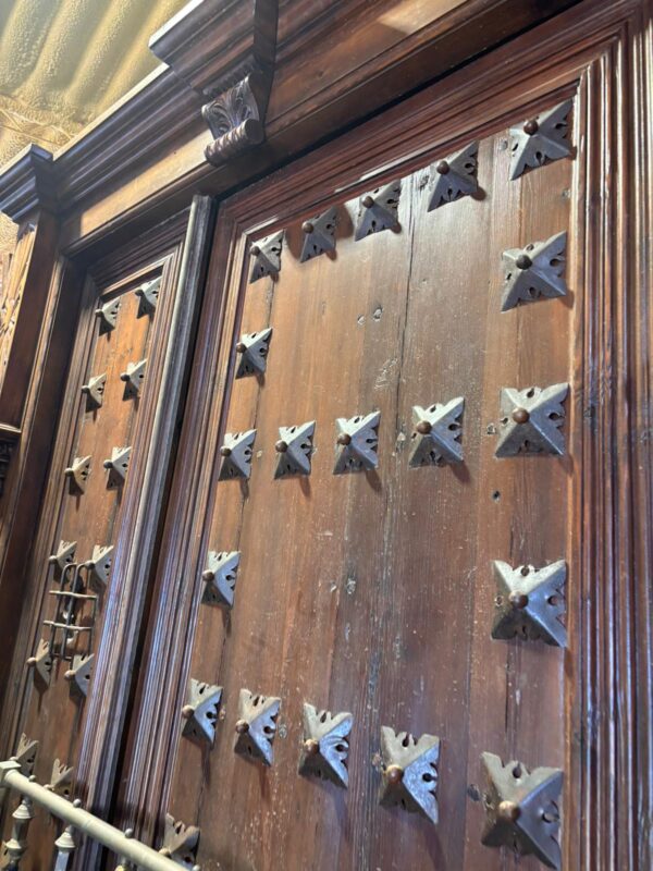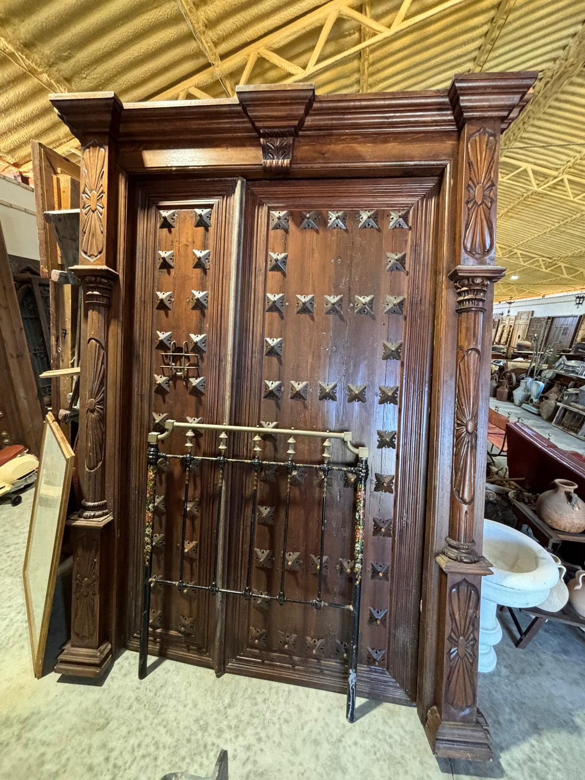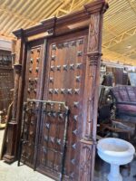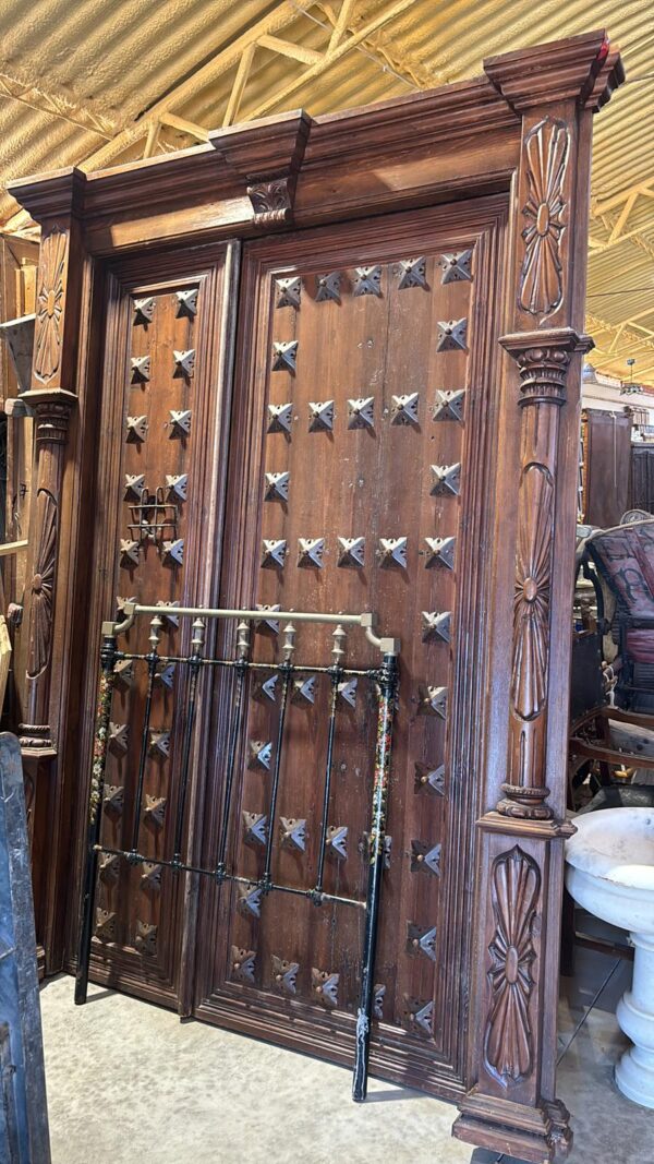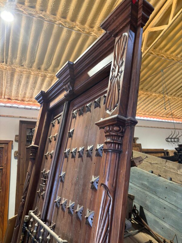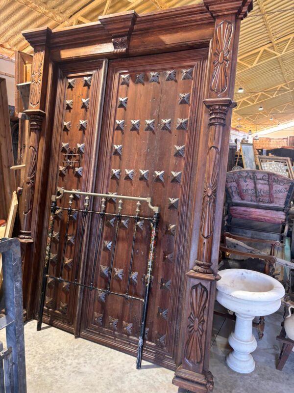 Portón de clavos cuadrados con marco tallado (2,65 alto x 1,92 ancho)